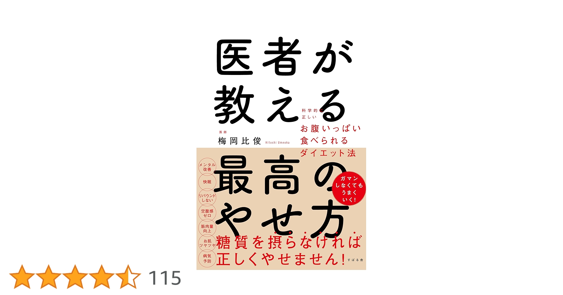 医者が教える最高のやせ方(梅岡 比俊)低糖質制限への注意と、お米を含めたバランス食重視比較的ストレスが少ない。好きなものを我慢しすぎない方向性リバウンドや心身の不調への警鐘あり;睡眠・生活リズムの改善も重視お米の食べ方・食事構成・昼夜・間食など具体案あり多少一般論寄り。どこまで調整するかは読者次第