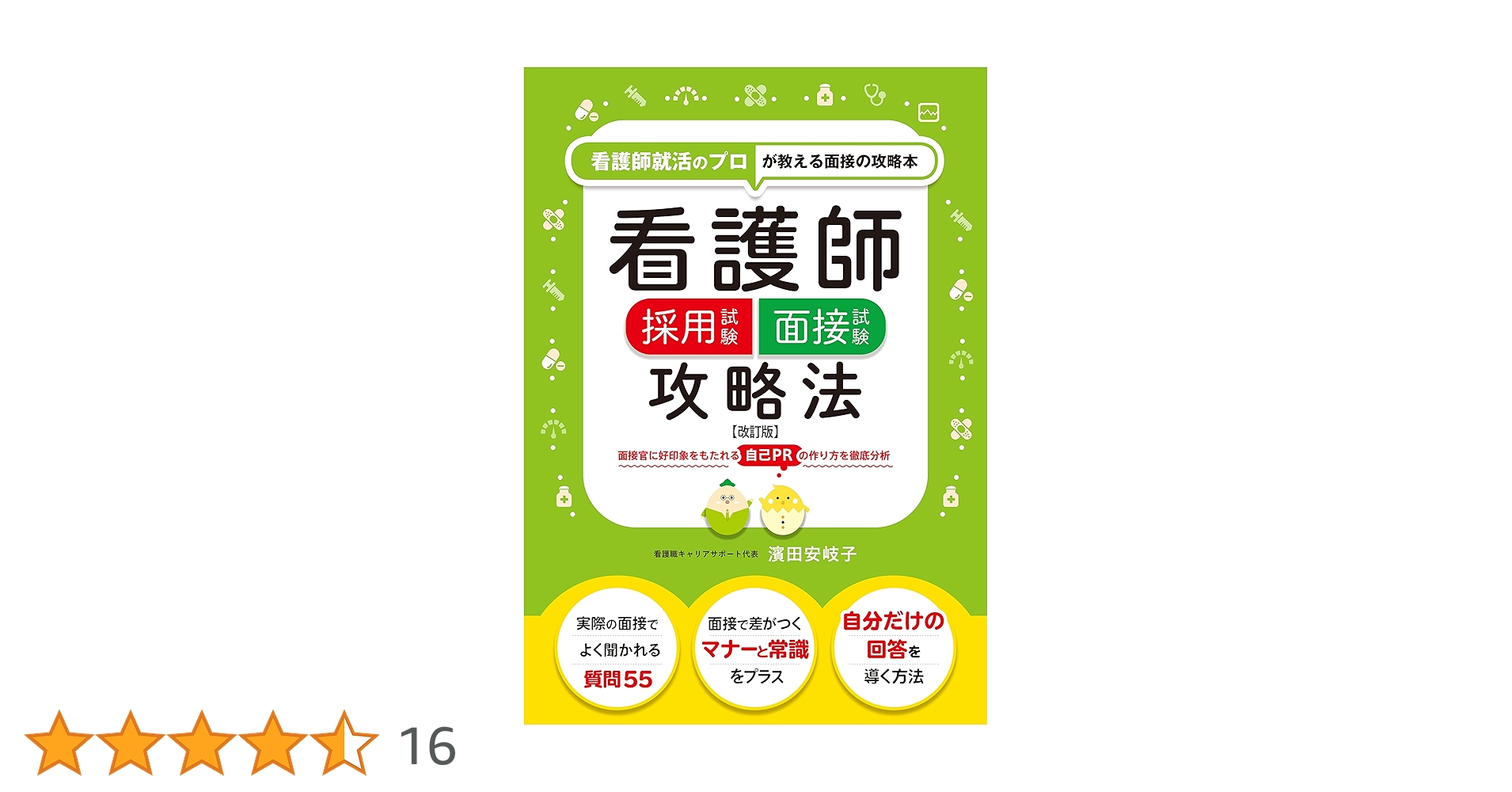 看護師採用試験 面接試験攻略法 | 採用試験面接で合格率を上げる準備と心構えを整える | 新卒看護師・採用試験を控えている人 | 面接に特化していて具体的/マナー・非言語・逆質問などきめ細かい部分まで扱っている | 採用試験の他要素(筆記・実技・適性など)は扱っていない/志望動機等、個人差が出る部分は自分でカスタマイズが必要 |