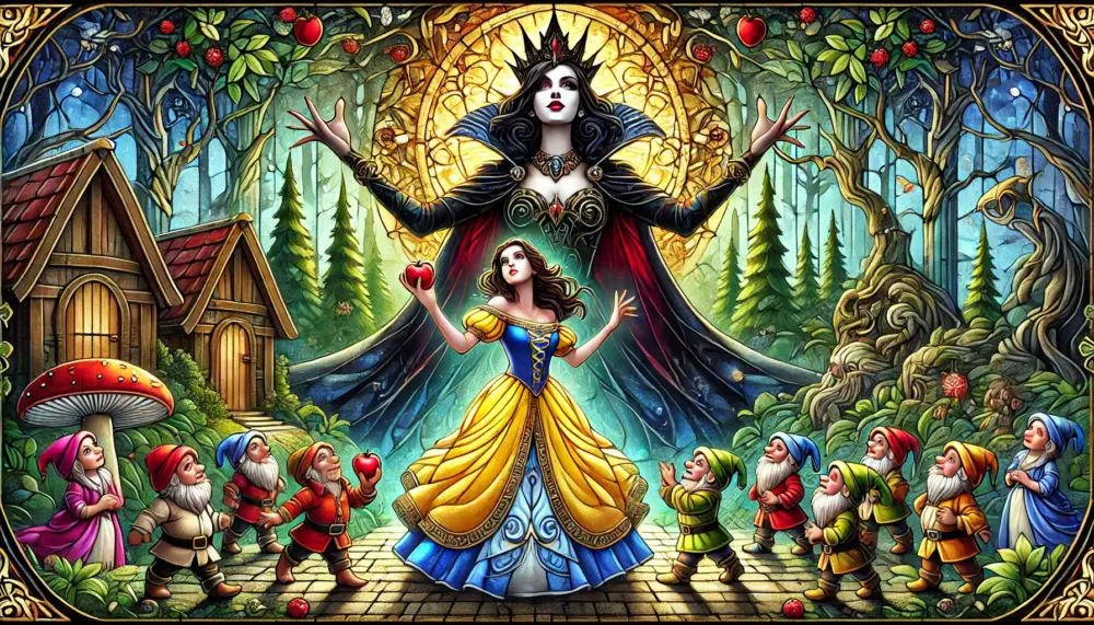 彼らと共同生活を始めた白雪姫は、掃除や料理を通じて家を整えるだけでなく、「人と協力して生きる」ことを学びます。森の仲間たちもまた、白雪姫によって自分の役割や居場所を見つめ直し、少しずつ“家族”のような絆を育んでいきます。 しかし、女王はそれを許しません。魔法の力で老婆の姿に変身し、白雪姫のもとへ毒リンゴを届けるのです。